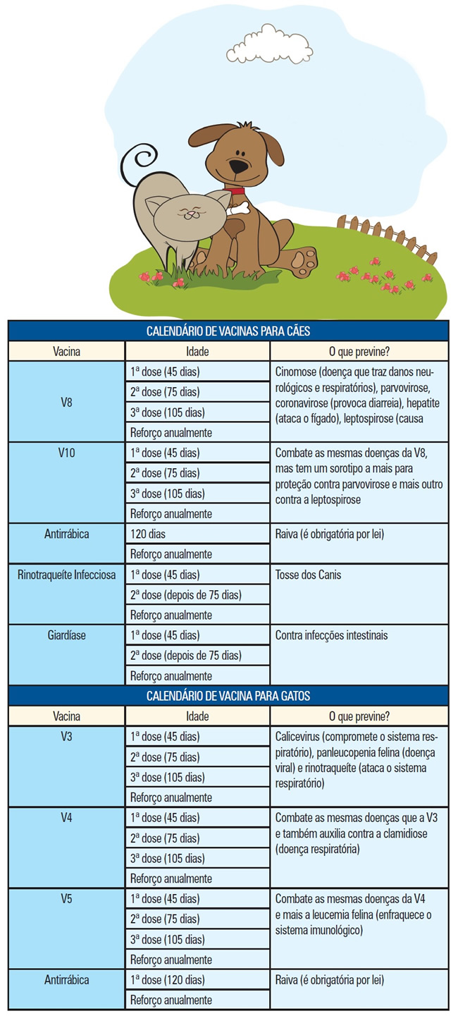 Então, você tem em mãos a carteirinha de vacinação do seu animal? Quem tem pet em casa não pode falhar nesta missão, vital para todos. A vacinação é o método mais confiável e eficaz de proteger os cães e gatos contra doenças infecciosas (algumas delas, até fatais, como Cinomose, Parvovirose e Raiva). Ou seja, nada de vacilar quando a vida do seu pet está em jogo. Mantenha a carteirinha dele sempre em dia, e fique de olho no calendário de vacinação.